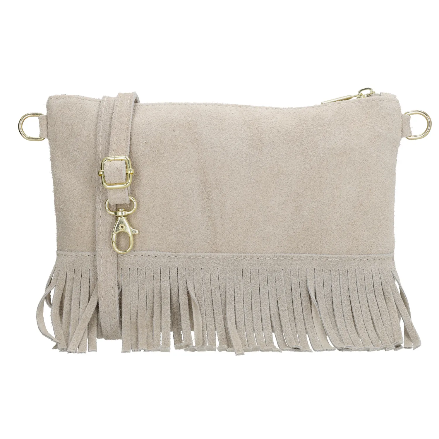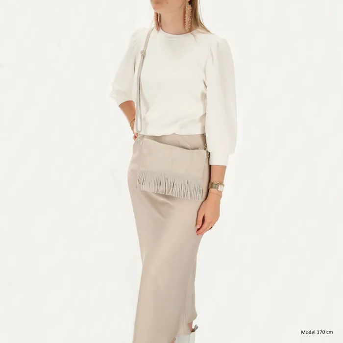 Béžová strapcová vintage crossbody kabelka "Carrie" má kvalitný kožený povrch, dlhé kožené ramienko. Béžová strapcová vintage kabelka cez rameno "Carrie" má zapínanie na zips a nastavitelné ramnienko.